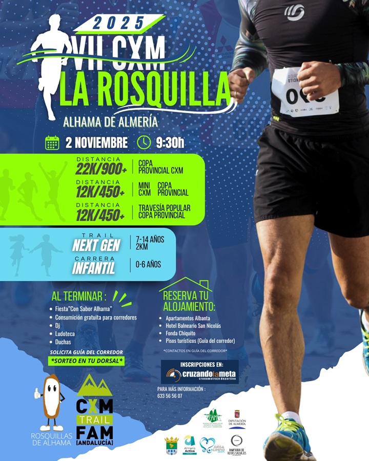 La VII CxM La Rosquilla 2025 se celebrará el domingo 2 de noviembre en Alhama de Almería, con salida y meta en la Plaza de España. Esta cita, ya consolidada en el calendario andaluz de trail running, forma parte de la Copa Provincial de Carreras por Montaña de Almería (FAM) y atrae cada año a corredores de toda la provincia. Los participantes disfrutarán de los paisajes de la Sierra de Gádor, con un recorrido que combina senderos, pistas y tramos técnicos con vistas espectaculares del valle del Andarax.